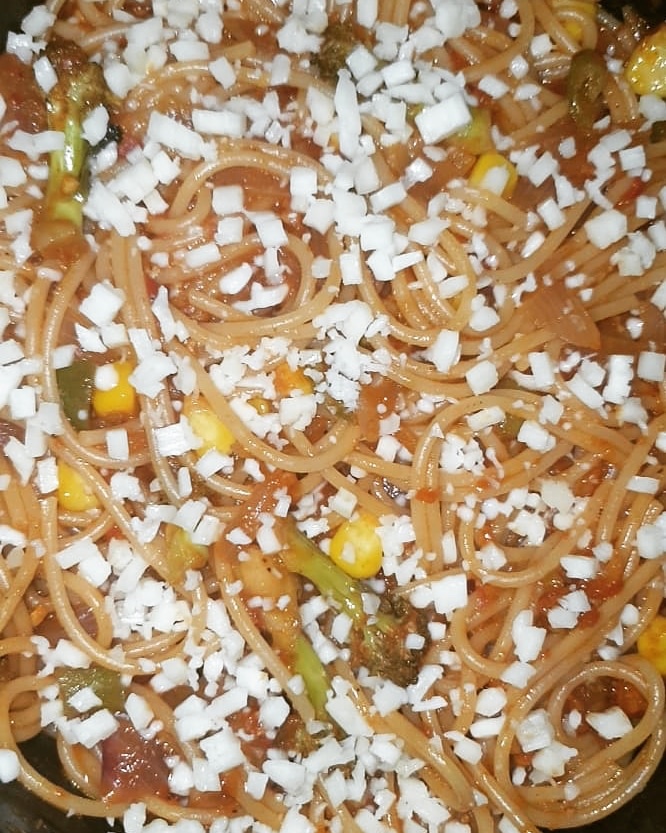 - Now, throw in your boiled spaghetti and mix.